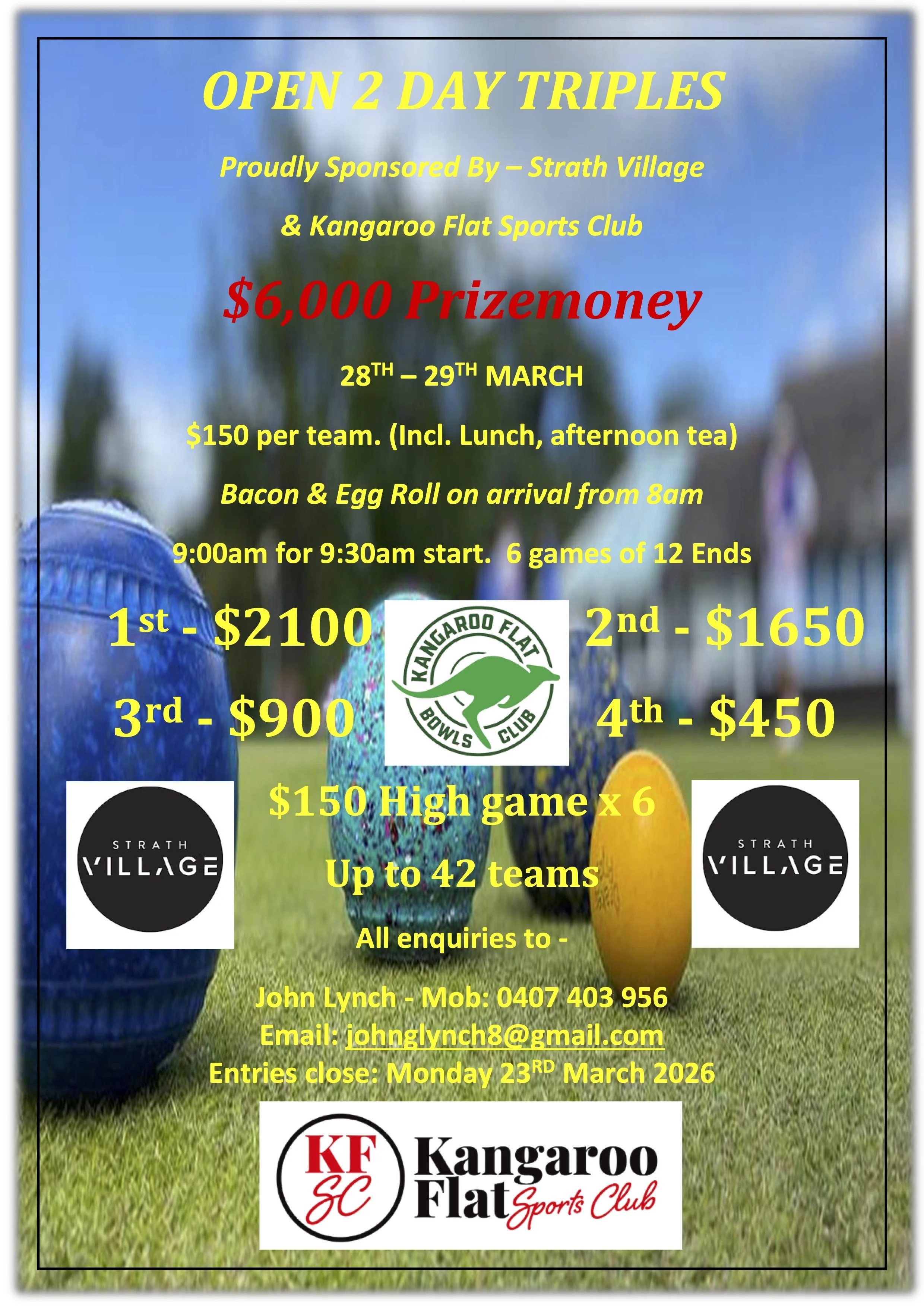 Sponsors – We are extremely fortunate to enjoy strong and ongoing support from our sponsors: Kangaroo Flat Sports Club, Ultimate Tyre & Auto, Click Control Systems and Moama Bowls Club. Their backing is greatly appreciated.